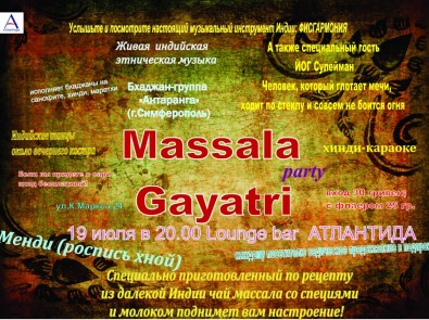 847 0 2 Феодосия • Анонсы 19 июля в 20.00 Massala party - вечер Индийского творчества в Lounge bar Атлантида! 19 июля в 20.00 Massala party - вечер Индийского творчества в Lounge bar Атлантида!Вход 30гривен, по флаеру - 25гр. Флаера можно взять на стойке в баре АТЛАНТИДА, в Магазине Индийской бижутерии по ул. Старшинова (в кругу), а также у распространителей на набережной.