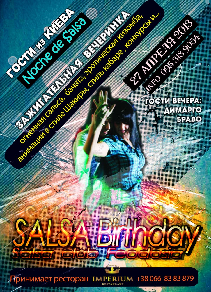 Сальса Клуб Феодосия ПРИГЛАШАЕТ отпраздновать свой 1 день рождения и насладится Международным днем танца. Этот праздник, посвященный всем стилям танца,утвержден в 1982 году Международным советом танца ЮНЕСКО и отмечается 29 апреля. В нашем городе много танцоров, которые радуют горожан абсолютным разнообразием стилей и направлений. Социальные танцы становятся все более популярными в силу своей доступности каждому желающему, независимо от возраста, телосложения или толщины кошелька. Познакомится с новыми гранями этого направления приглашает Ирина Орлова,руководитель САЛЬСА КЛУБ Феодосия. Праздничная вечеринка SALSA BIRTHDAY состоится в ресторане Империум 27 апреля. "Мы хотим удивить феодосийцев и, может, даже самих себя, - поделилась Ирина- мы подготовили несколько новых номеров в необычном для нас стиле, программа обещает быть интересной" Вечер наполнят огненная сальса, феерическая руэда, нежная бачата, эротическая кизомба, танцевальные мастер - классы от Noche de Salsa (г.Киев), анимации в стиле Шакиры, эксклюзивное выступление в стиле кабаре , конкурсы и... много больше!!! Гости вечера: Noche de Salsa(г.Киев) , Сальса клуб Симферополь, студия социальных танцев ДИМАРГО (г.Феодосия) , Танцы Живота Браво(г.Феодосия) и многие другие танцевальные коллективы!!! На прощание Ирина поделилась фирменным рецептом хорошего настроения: "Танец, он у каждого "свой", попробуйте танец на вкус вместе с нами!" НАЧАЛО МЕРОПРИЯТИЯ в 21 -00!!Dress Code: чувственные наряды и предвкушение. Спешите заказать столик.
