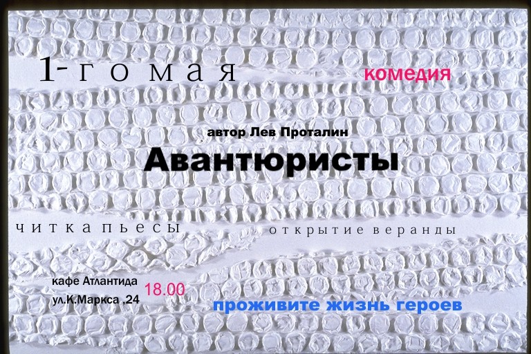 1-го мая в 18.00 в кафе Атлантида (ул. К. Маркса, 24) группа свободных чтецов NAFFTALYN прочитает пьесу-комедию Льва Проталина "Авантюристы". Комедия в два действия, прочитается 3-мя актерами-любителями. История молодой пары, которая нашла друг друга вопреки своим стереотипам. Что из этого получится?.. Приходите и узнайте!))