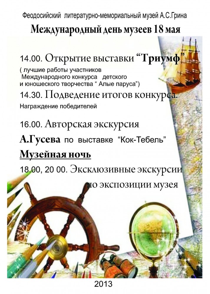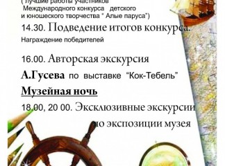 Как рассказала старший научный сотрудник музея Ирина Панаиоти, в этот день состоится открытие выставки "Триумф", подведение итогов конкурса "Алые паруса", авторская экскурсия А. Гусева по выставке "Кок-Тебель".
