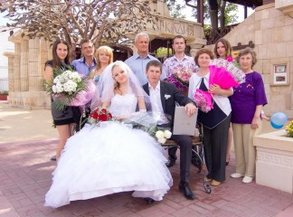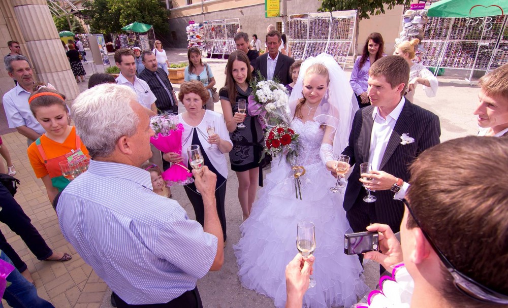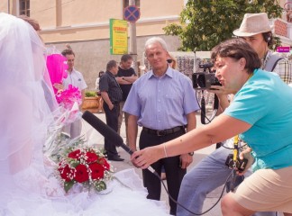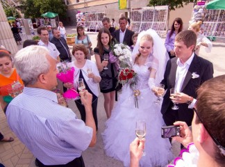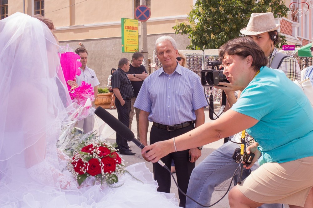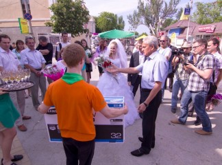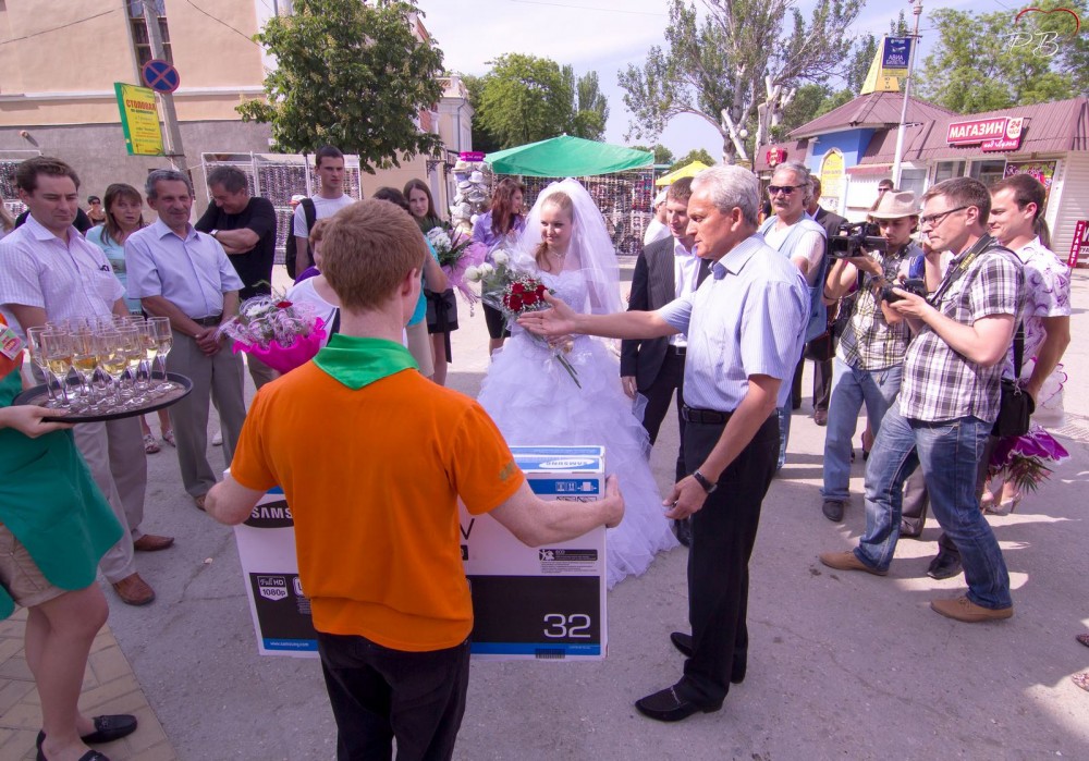 Подарки мэр вручал у нового уголка отдыха - на углу бистро "Аркадия". Градоначальник поздравил молодых с торжественным днем, вручил подарки и сфотографировался по очереди с новой семьей на память.