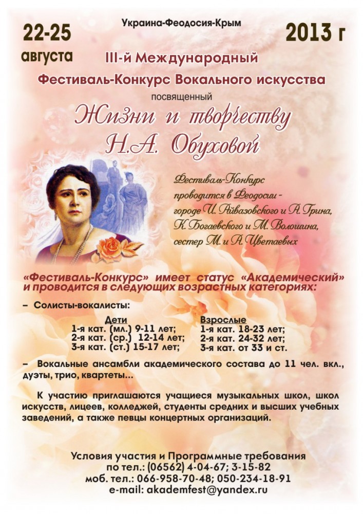 С 22 по 25 августа в Феодосии пройдет III Международный фестиваль-конкурс вокального искусства им.Н.А.Обуховой. Об этом сообщил автор проекта, заслуженный работник культуры Украины Ефим Заславский.