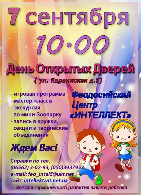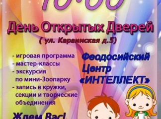 Незаметно пролетело лето и мы начинаем новый учебный год. Дорогие ребята и уважаемые родители, приглашаем вас в Феодосийский городской центр эколого - натуралистического творчества учащейся молодежи "Интеллект".7 сентября 2013 года 10-00 в день открытых дверей вас ждет игровая и концертная программа, экскурсия по мини-Зоопарку, мастер-классы по изготовлению сувениров и многое другое. В день открытых дверей проводится набор в кружки, секции и творческие объединения Центра. Мы найдем занятие по душе для каждого ребенка. Подробнее о нас на сайте intellekt.vit.net.ua
