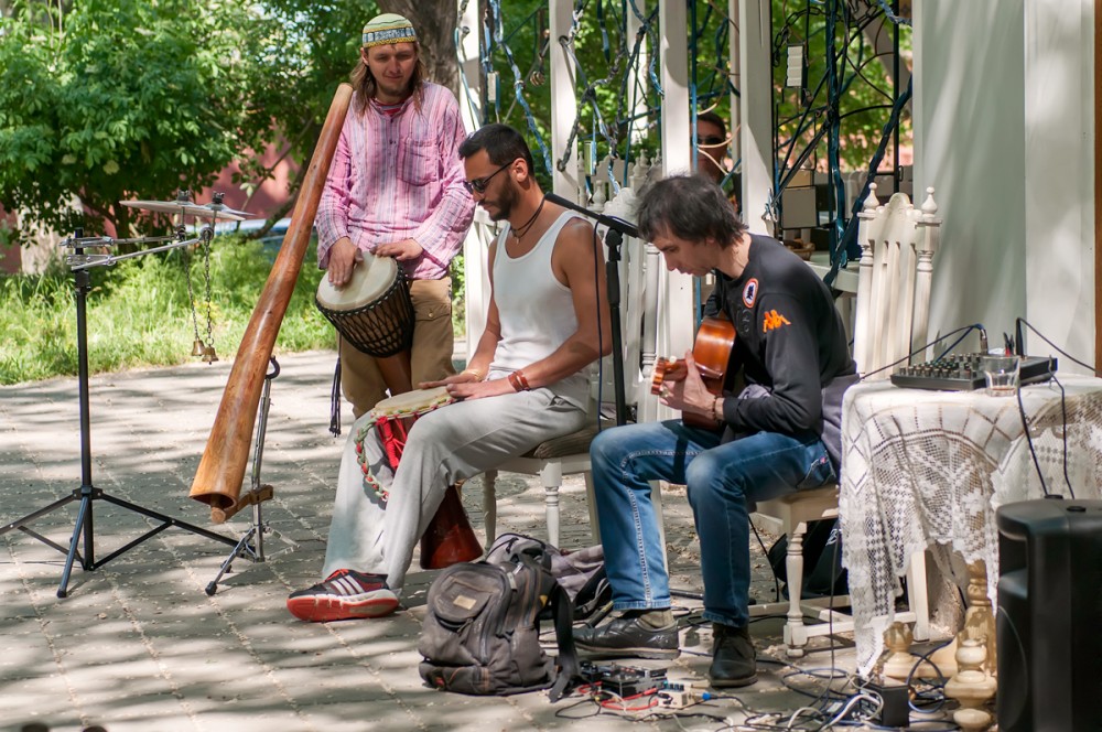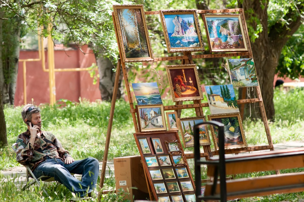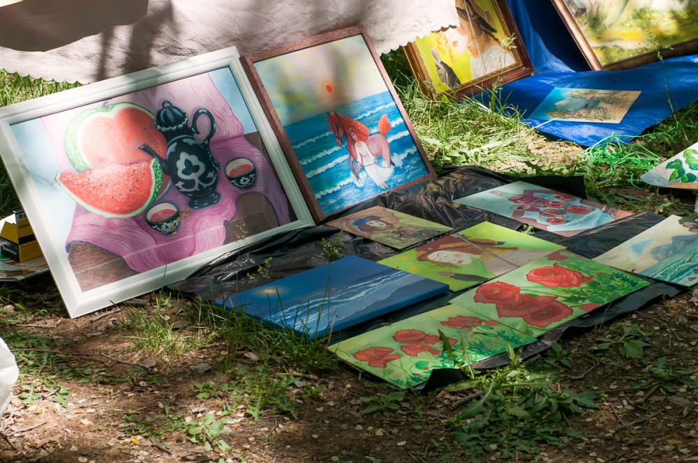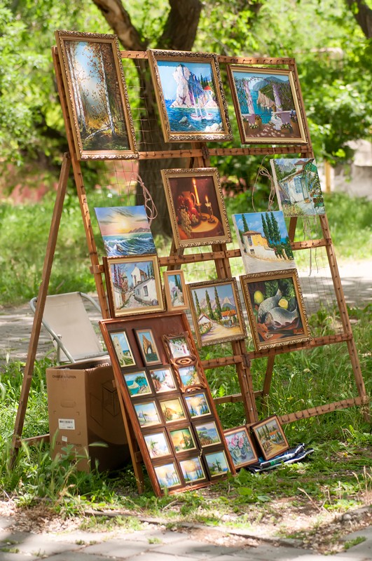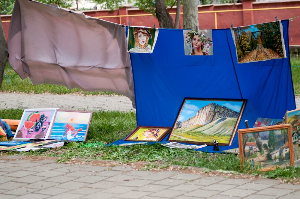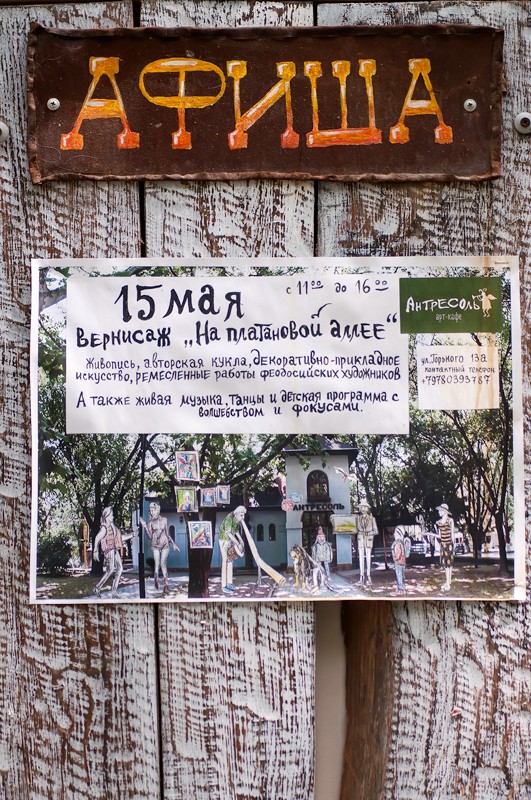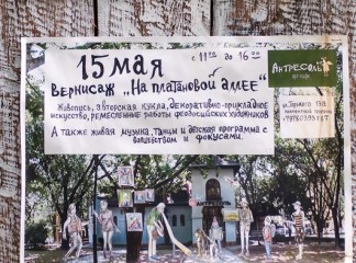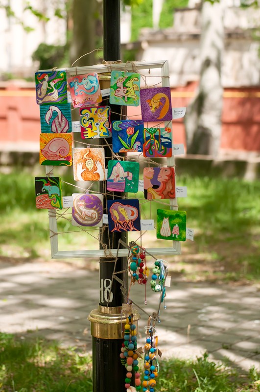 15 мая прошел вернисаж, третий по счету, на котором были представлены живопись, авторская кукла, декоративно-прикладное искусство, ремесленные работы феодосийских художников. Этот не коммерческий проект возник на энтузиазме любителей творчества и благодаря знакомству Марии Переваловой и директора замечательного арт-кафе "Антресоль" Ирины. На вернисаже также присутствовала живая музыка. Детскую программу с волшебством и фокусами представил Никита Беляков - фокусник и режиссер, организатор фестиваля гениального зрителя в п. Орджоникидзе. Вернисаж прошел весело и не принужденно, и посетили его не только люди, но и местные обитатели фауны. Отдельно хочу заметить, что не обошлось без небольшого происшествия - упала ветка на скамейку, где незадолго до этого сидели пожилые люди, а новые не успели занять место, по счастливой случайности никто не пострадал.